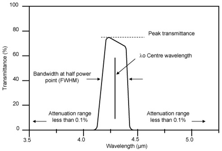 Bandpass filters are designed to isolate a relatively wide spectral band. They are classified by having bandwidths (measured at half-peak transmittance levels) between 6% and 14% of the centre wavelength value. When ordering, the bandwidth can be expressed as a percentage of the centre wavelength or can be given in microns. The filters exhibit high peak transmission in the passband (typically greater than 70%) and very low transmission levels outside the passband (typically less than 0.1%).